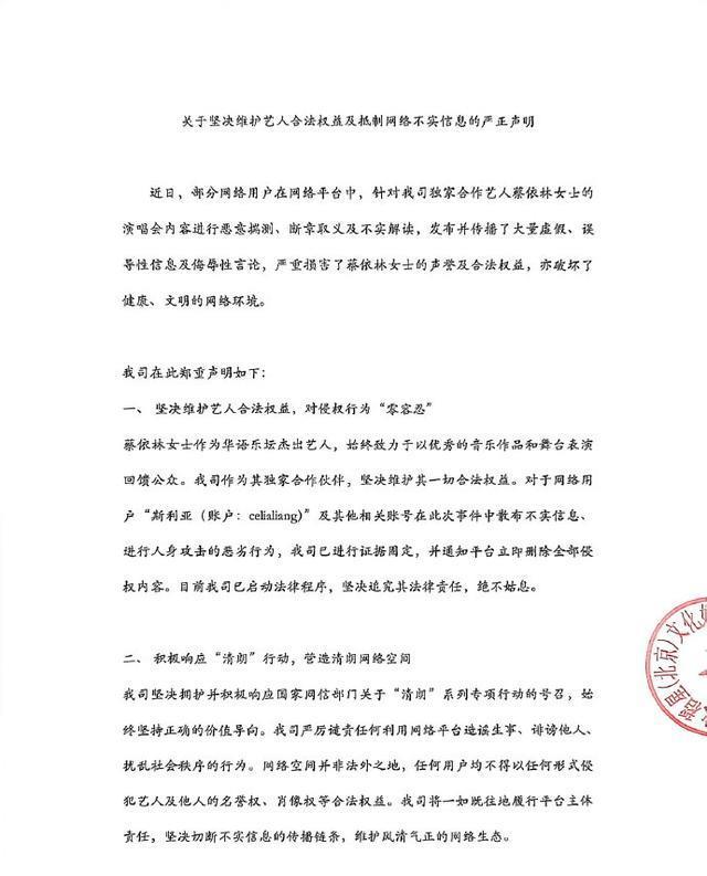 声明提到,近期,部分网络用户在网络平台针对蔡依林的演唱会内容进行恶意揣测、断章取义及不实解读,发布并传播了大量虚假、误导性信息及侮辱性言论,严重损害了蔡依林的声誉及合法权益,亦破坏了健康、文明的网络环境。